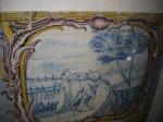 Escadas com silhar de azulejo figurativo, em tons de azul e branco, e guarnição de concheados polícroma.