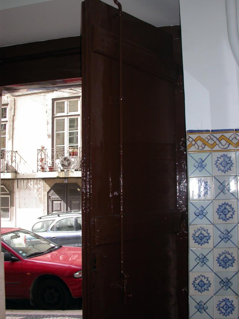 Átrio revestido por azulejos de padrão pombalino (P-18-00010 e P-18-00011), dispostos em silhar, incluindo cercadura (C-18-00019) articulada com os respectivos cantos.